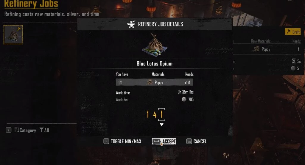 Когда у вас есть необходимые материалы, вам нужно взаимодействовать с Лабораторией и выбрать опцию "Предоставить материалы", чтобы просмотреть доступные рецепты товаров. Затем выберите товар и установите количество, чтобы начать производство. Производство каждого товара потребует определенное количество материалов и комиссию в серебре, а также займет определенное время. Если вы производите опиум в больших количествах, вам придется ждать около полчаса или даже часа, чтобы получить готовый продукт.
