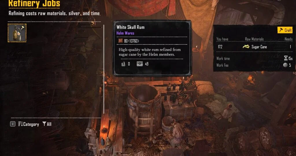 Когда у вас есть необходимые материалы, вам нужно взаимодействовать с винокурней и выбрать опцию "Предоставить материалы", чтобы посмотреть список доступных товаров, а затем выбрать товар и указать количество, чтобы начать его производство. Производство каждого товара будет стоить определенное количество материалов, а также комиссию (серебро), и займет определенное время. Если вы производите ром массово, то придется подождать полчаса или даже час, чтобы получить готовую продукцию.
