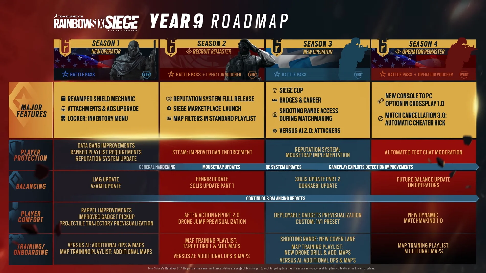Ubisoft провела свежую презентацию, посвященную девятому году поддержки Tom Clancy's Rainbow Six Siege. В течение года фанатов ждут четыре сезона с улучшениями и нововведениями, включая двух новых оперативников. Кроме того, были анонсированы изменения в системе выдачи банов, различные обновления и многое другое.
