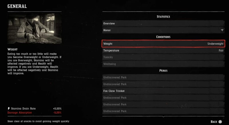 У персонажа со средним весом здоровье и выносливость не подвергаются изменению. Однако если ваш вес будет чрезмерно низок, вы будете получать больше повреждений, но в то же время повысите запас выносливости, что компенсирует первый недостаток. Если Артур будет часто есть, то вскоре растолстеет. Это снизит получаемый урон, но негативно скажется на выносливости — теперь ваш герой не сможет передвигаться без передышки на те расстояния, на которые без проблем перемещался ранее.