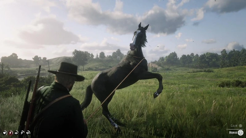 Red Dead Redemption 2 — это, по сути, Grand Theft Auto в сеттинге Дикого Запада. Но первое, что отличает данную игру от своего современного аналога — то, что завладеть чужим "транспортом" в RDR 2 намного сложнее. Лошади агрессивно ведут себя при приближении незнакомца или наличии хищника на локации неподалеку, поэтому прежде, чем с ней можно будет взаимодействовать, вы должны будете ее успокоить. Если подойдете к коню сзади, то не ждите ничего хорошего. Скакун может настолько разозлиться (или испугаться), что боднет Артура своими задними копытами.