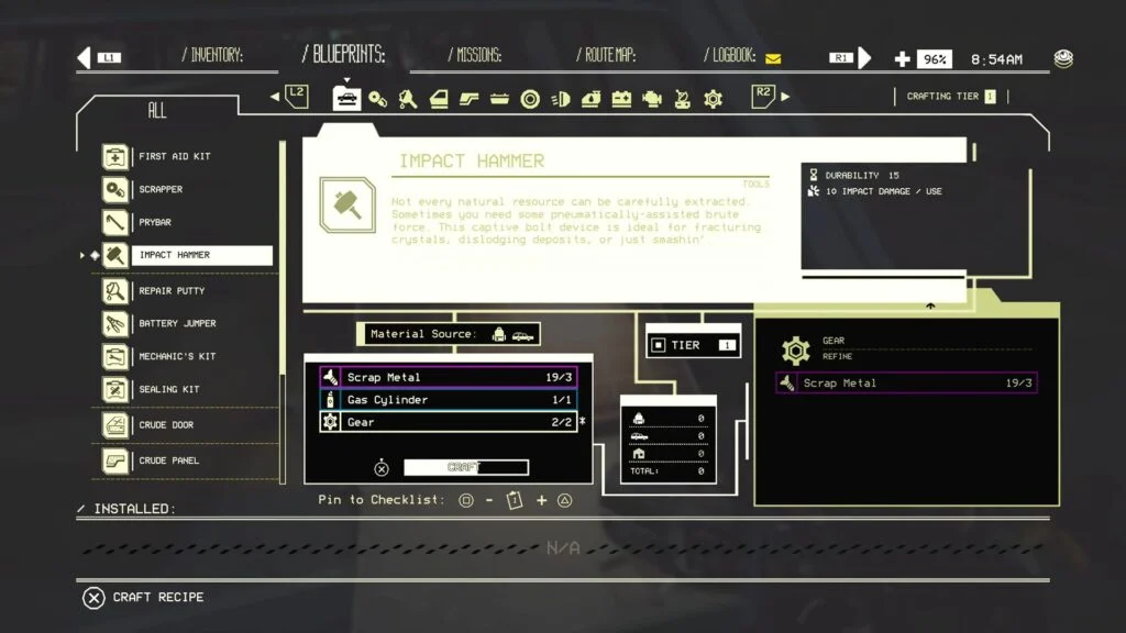 4. Когда чертеж будет в вашем распоряжении, перейдите на верстак в автомагазине или откройте багажник вашего автомобиля, чтобы получить доступ к верстаку. Найдите рецепт ударного молота, который будет доступен на верстаке. Следуйте инструкции и используйте следующие ресурсы для создания ударного молота: