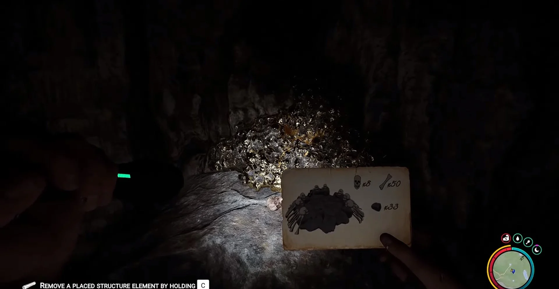 Пройдя внутрь пещеры, идите вдоль тропы и направляйтесь вправо, чтобы найти чертеж Телепорта рядом со скелетом и большим кольцевым узлом Солафитского узла. Возьмите чертеж, чтобы добавить рецепт Телепорта в Блокнот, и не забудьте собрать Солафитовую руду, поскольку она необходима для активации Артефакта.
