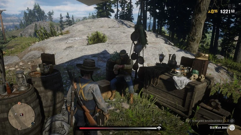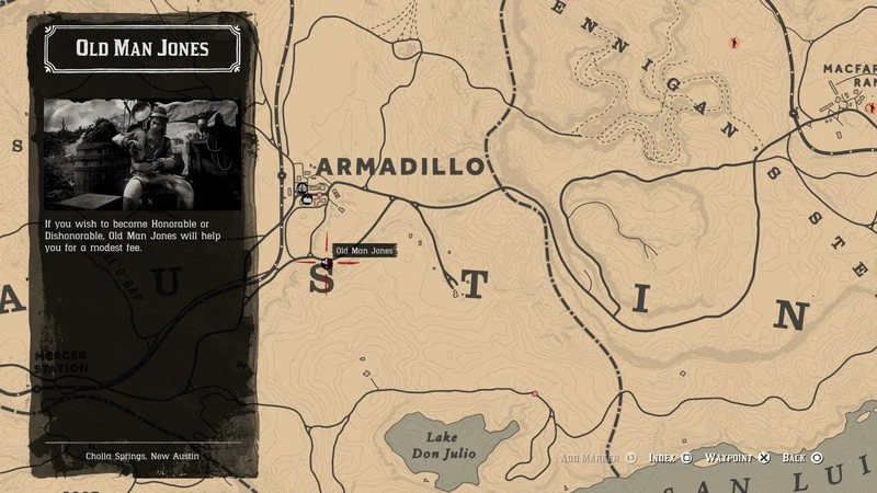 Если вам когда-либо понадобится сбросить счетчик чести в RDO до нейтрального значения, то заранее приготовьте три золотых слитка. Их нужно будет платить каждый раз, когда выполняется данная процедура. Отправляйтесь к старику Джонсу. Его расположение мы указали на скриншоте выше.