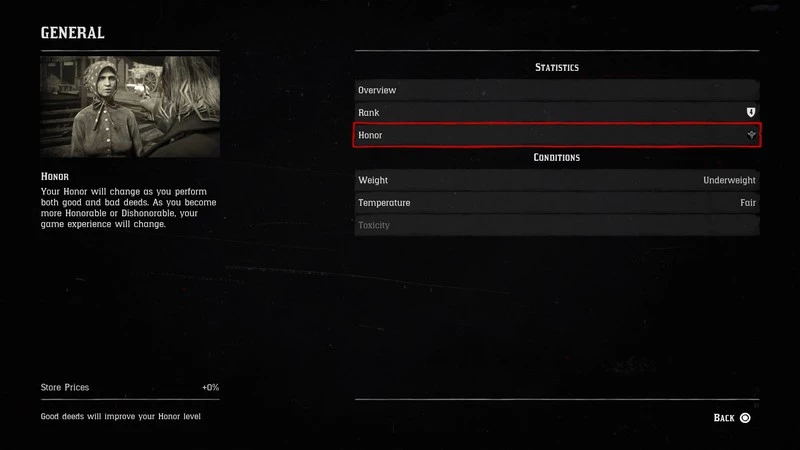 Перейдите в меню паузы, чтобы проверить текущее значение чести. Откройте раздел "Игрок", а затем выберите своего персонажа. После этого перейдите в раздел "Общие" и среди прочих данных увидите уровень чести. В левом нижнем углу также появится строка, в которой указывается, влияет ли текущий уровень чести на окружающий мир в Red Dead Redemption. К примеру, если у вас высокий уровень чести, то цены на товары в магазине будут снижены. Если же вы поступаете плохо, то будьте готовы увидеть завышенные ценники.