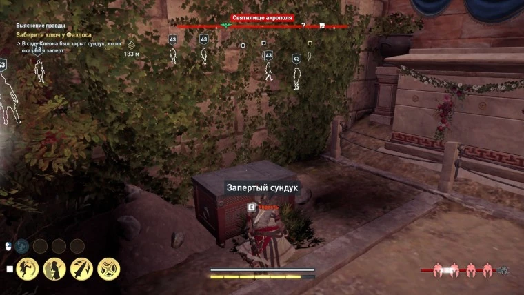 Выходите в сад, где найдете запертый сундук. Ключ находится у стражника храма Афины. Забрать ключ незамеченным будет проблематично. Лучше всего его убить на виду у всех, завладеть ключом и подождать, пока тревога уляжется. Затем возвратитесь в сад и откройте сундук.