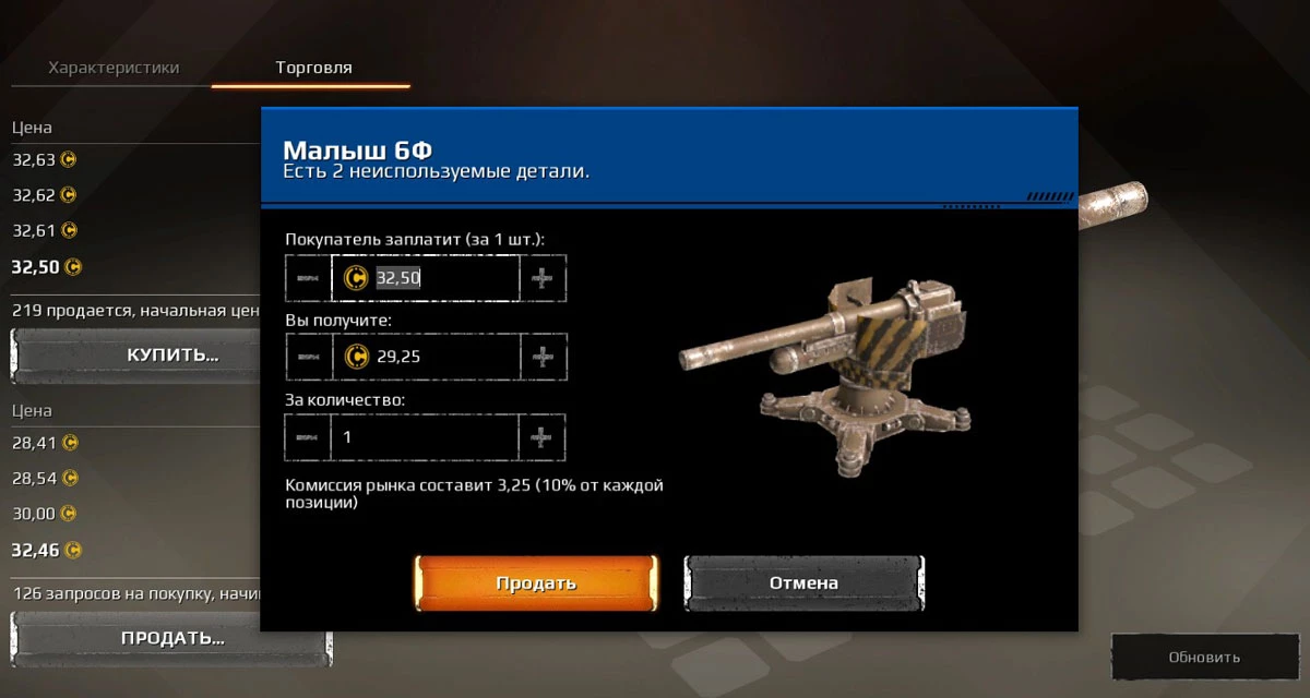 В нижней части экрана отображается количество запросов на покупку этого предмета и подходящая потенциальным покупателям цена. Вы можете продать предмет сразу же, если она вас устраивает, или установить собственную цену. В последнем случае придется ждать, пока предмет не выкупят. Учитывайте, что рынок забирает комиссию – 10 % от суммы сделки.