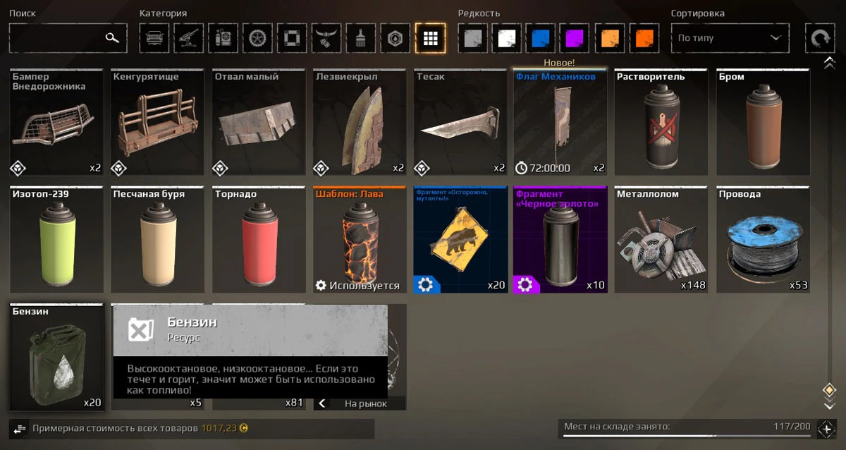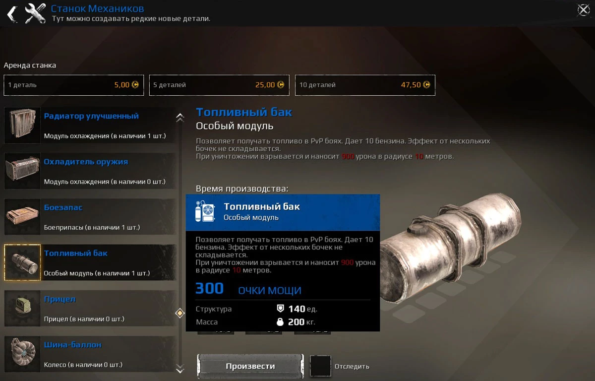 Если на ваш автомобиль экипирована топливная бочка, вы можете получить 5 бензина при победе в PVP-потасовке, если водитель остался жив (т.е. цела кабина). На станке Механиков можно скрафтить топливный бак, который позволяет получить 10 бензина при соблюдении этих же условий. Если вы умелый игрок, то будете регулярно получать бензин, который можно использовать для фарма меди или продать на рынке. Учитывайте, что при разрушении, бочка взрывается и наносит урон всему вокруг, в том числе остаткам вашего автомобиля, поэтому компонуйте ее на транспортное средство так, чтобы ее не прострелили в самом начале боя.