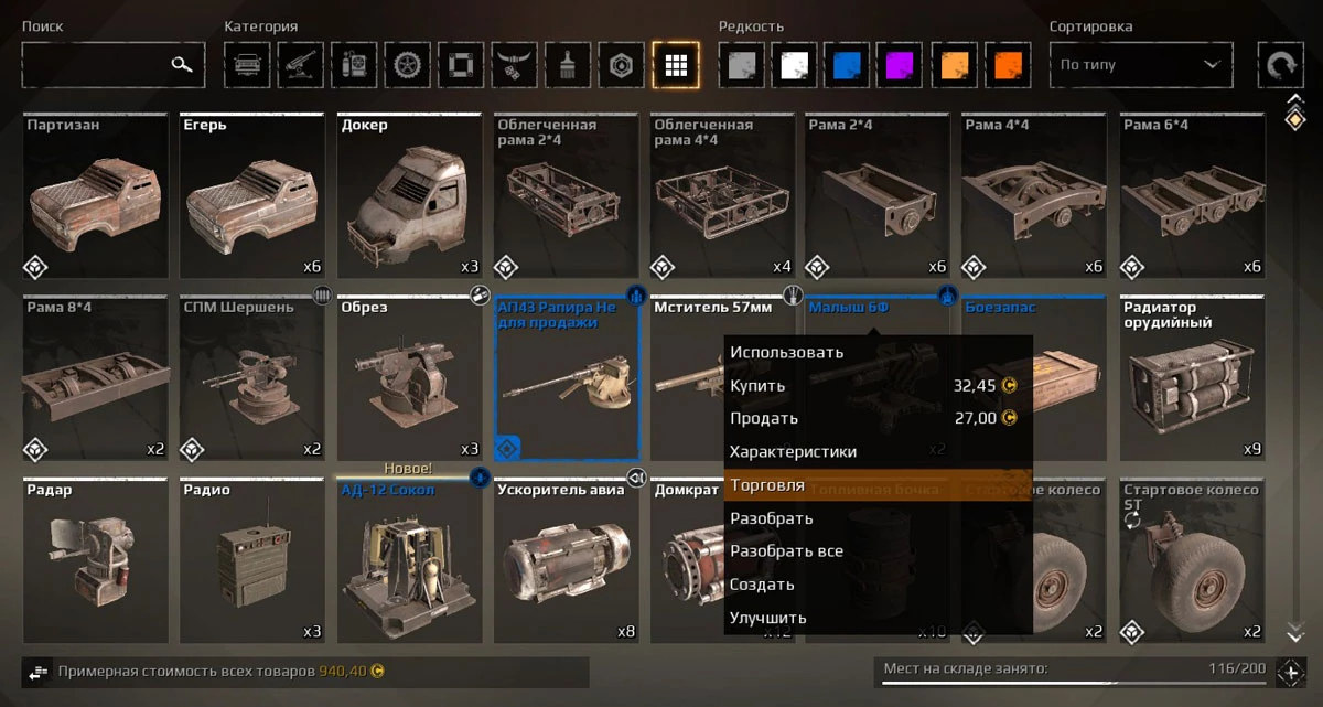 На рынке можно продать любую экипировку (за исключением непродаваемой, которая дропается из контейнеров, вручаемых за игровые достижения), а также ресурсы, которые накопились у вас в избыточном количестве. Чтобы отправить предмет на рынок, найдите его на складе, кликните по нему правой кнопкой мыши и выберите пункт «Торговля». Обратите внимание: так вы выручите больше голды, чем в случае выбора пункта «Продать».
