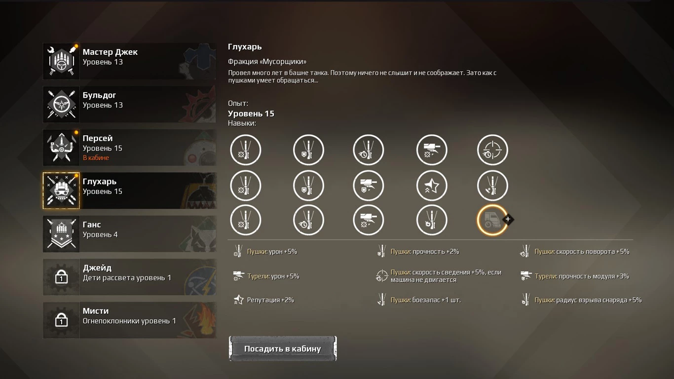 Из водителей для танка самым эффективным считается Глухарь от фракции Мусорщики – только у него есть все необходимые для пушки перки: увеличение урона, прочности и скорости сведения, боезапаса и радиуса разрыва снаряда. Рекомендуется активировать все перки, кроме «Бешеный рык». Покупка весьма затратная в плане ресурсов, а дает всего лишь повышение предельной скорости кабины «Дальнобой» на 5км/ч. Не забываем, что, как уже упоминалось в первой части этого гайда, скорость движения танка ограничена скоростью гусениц, а увеличивать ее нужно по-другому. Кроме того, к тому моменту, когда вы прокачает Глухаря до возможности активации упомянутого перка, вы, скорее всего, уже будете использовать более мощную тяжелую кабину.