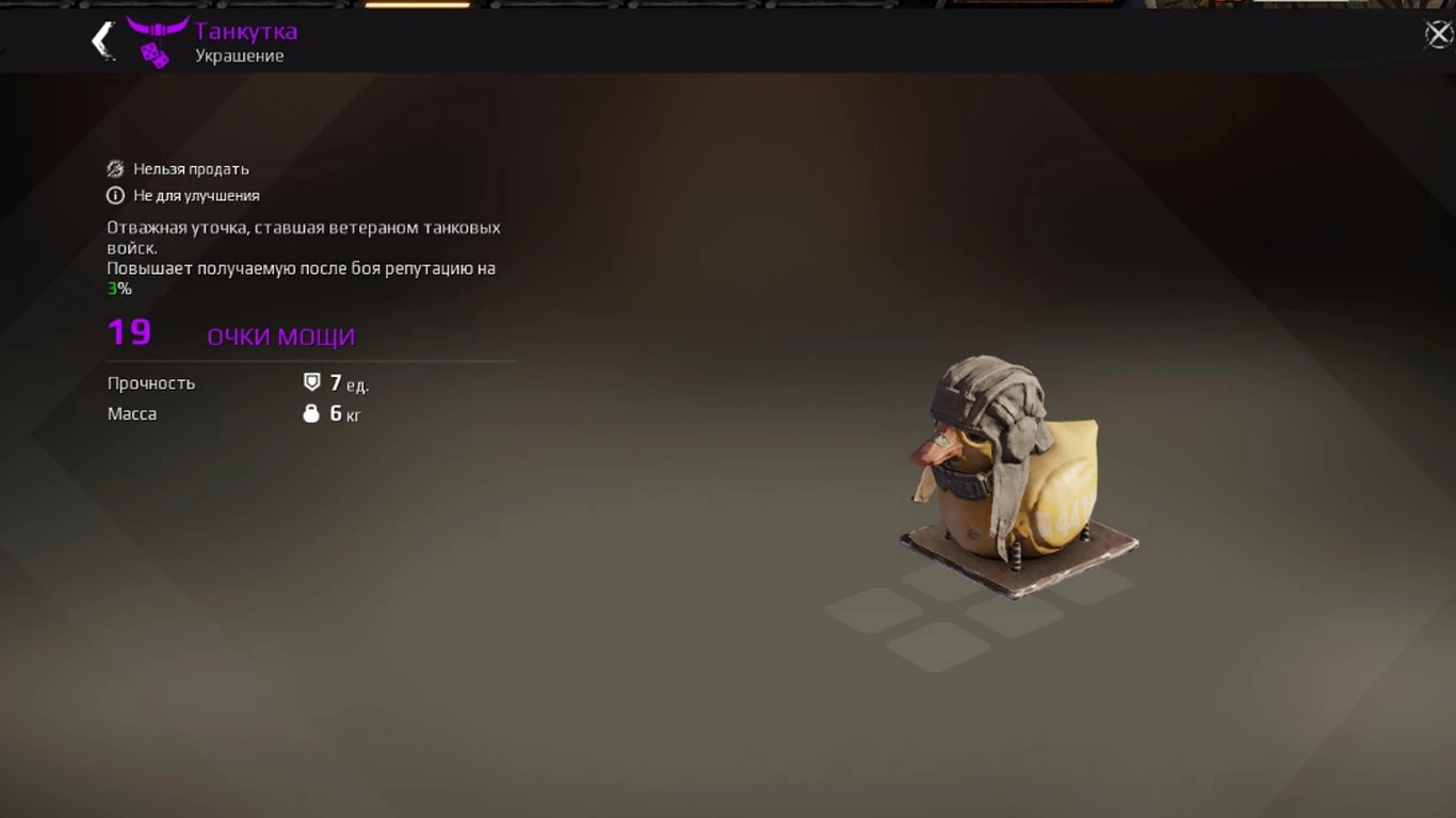 Награда за попадание в Алмазную лигу – Танкутка, уже знакомая игрокам по прочим ивентам фигурка резиновой уточки, на этот раз облаченная в шлем танкиста. Она не дает существенных бафов – только 3% к заработанной в бою репутации при условии, что на момент окончания схватки останется прикрепленной к крафту. Это – предмет престижа: согласно отзывам игроков, многие желающие, участвуя в рандомных боях, ее так и не получили.
