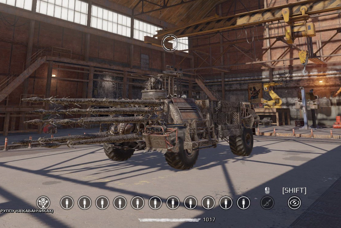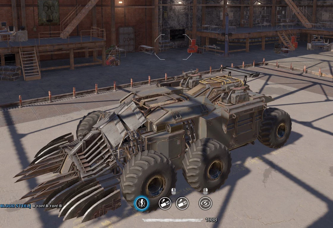 Крафт называют так из-за используемых орудий ближнего боя – жаток легендарного качество от фракции «Бешеные». Здесь уже есть место для творчества: можно собрать как типичный «нагибаторский» автомобиль, там и арт-крафт – стилизованный комбайн. На эффективность в бою внешний вид никак не влияет.