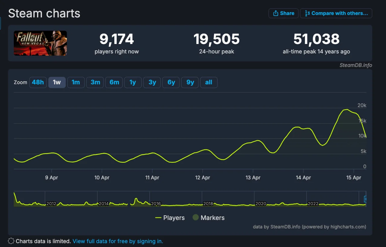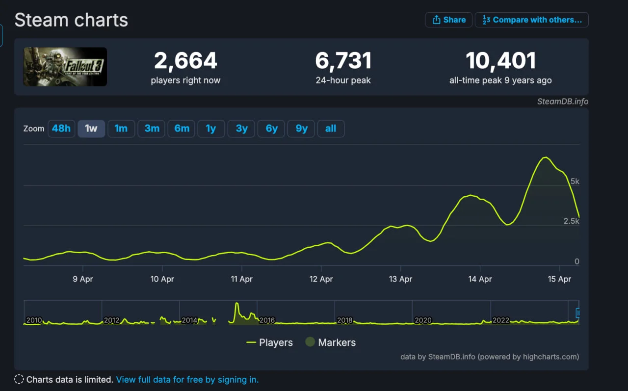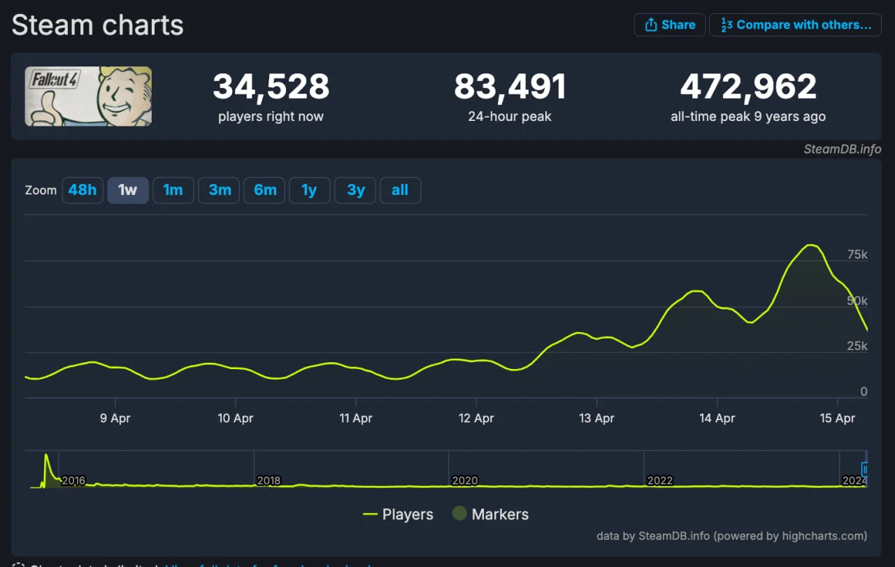 Онлайн-показатели продолжают расти и в других играх серии. Например, у Fallout 4 пиковый онлайн за последние 24 часа превысил 83,4 тысячи человек.