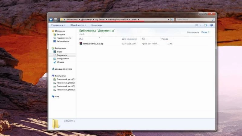 - Затем переместите загруженный архив в следующую папку: \Документы\MyGames\FarmingSimulator2019\mods.