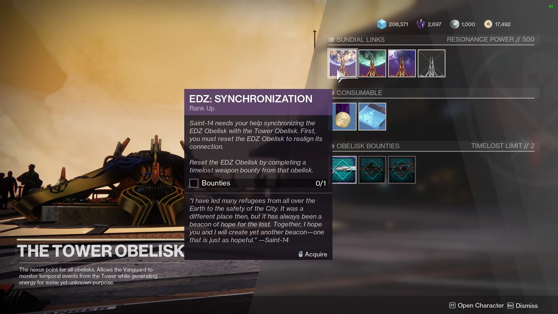 Все четыре квеста Синхронизации должны быть выполнены.То, что Обелиск наконец-то находится в Башне, не означает что вы можете пожертвовать Поляризованный Фракталин. Следующим шагом является выполнение квестов Синхронизации для четырех оригинальных Обелисков. Эти квесты находятся в верхней части страницы Башенного Обелиска.