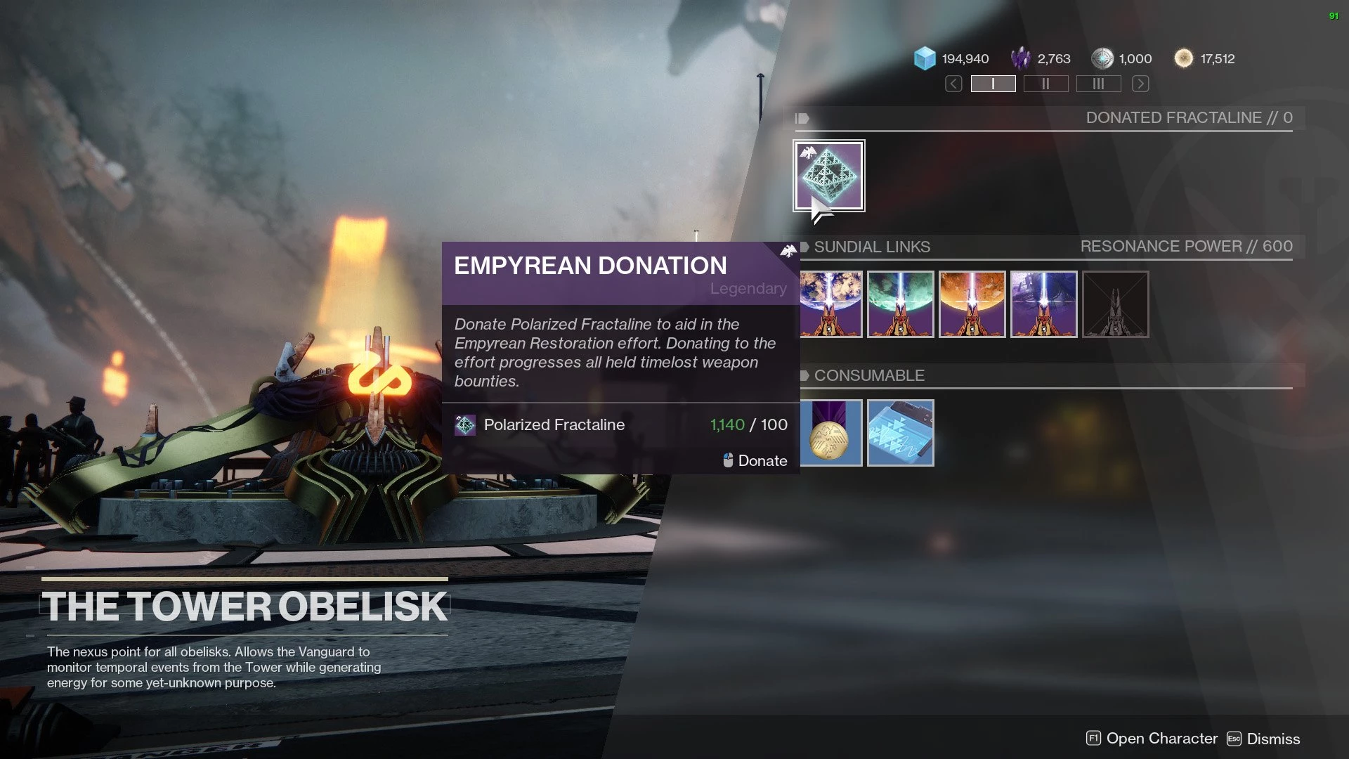 Наконец-то вы сможете пожертвовать Поляризованный Фракталин в Фонд Эмпирея.Здесь начинается самое интересное. На этом этапе вы откроете возможность тратить Поляризованный Фракталин на Небесное Пожертвование. Это прямо вверху страницы Башни Обелиска. Вы можете пожертвовать 100 поляризованных фракталинов за раз. Игроки, которые пожертвуют 5000 или более, получат специальную эмблему и откроют Триумф.