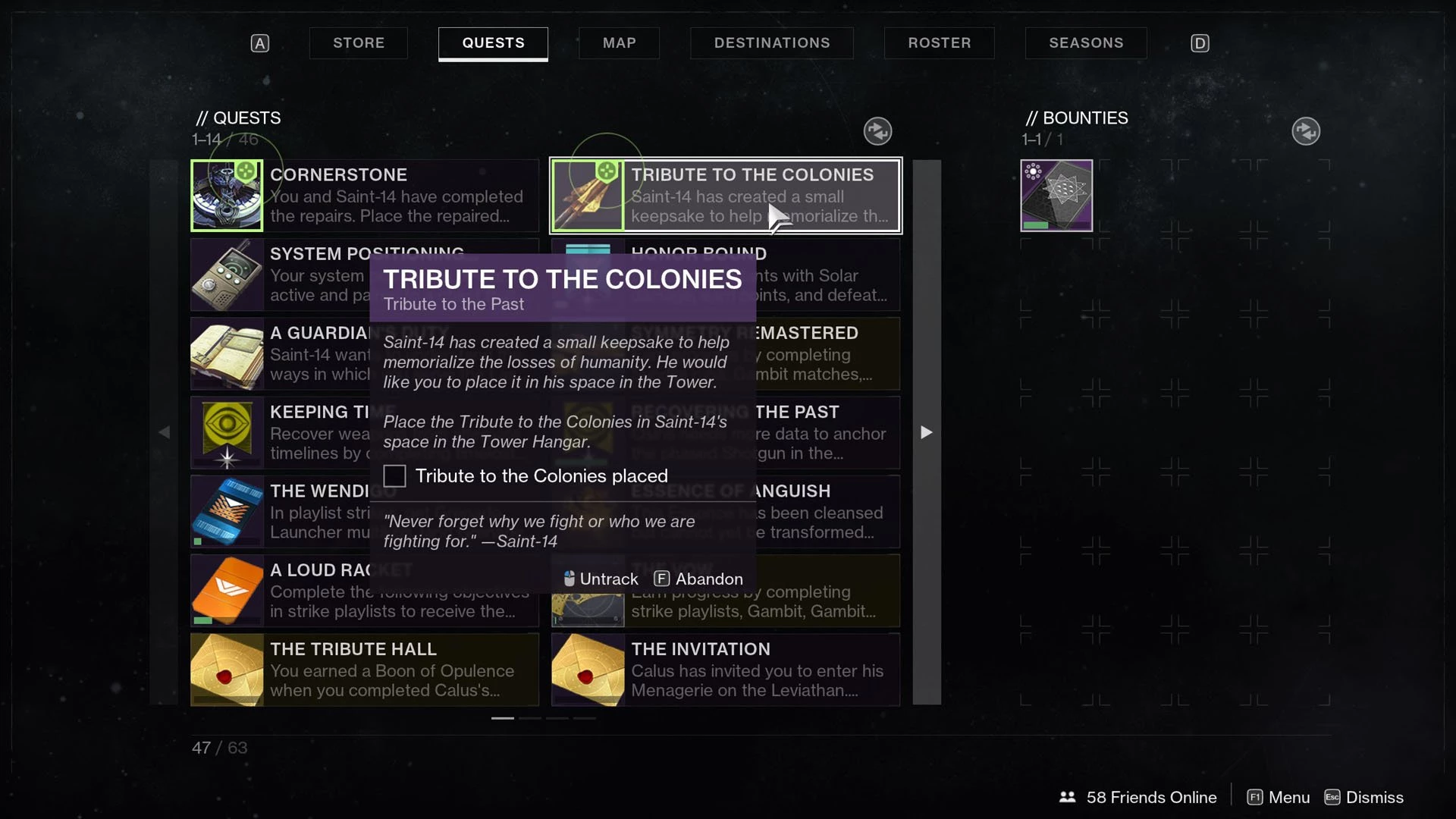Независимо от того, спасли вы его или нет, Saint-14 теперь должен быть виден в Башне для всех игроков. Разговор с ним должен раскрыть три квеста в его инвентаре: Дань Колониям, Долг Хранителя и Краеугольный камень. Все это должно быть завершено.