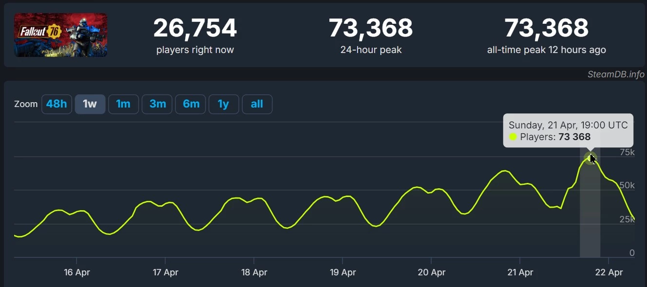 Fallout 76 вновь побила собственный рекорд пикового онлайна в Steam. Несколько часов назад в игре было зарегистрировано одновременное присутствие 73,368 игроков.