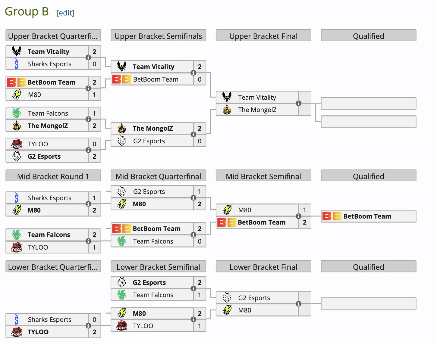 В группе “В” G2 Esports выбила Falcons, а М80 победила TYLOO. Проигравшие команды заняли 21-28 место и заработали 7 тыс. долларов.