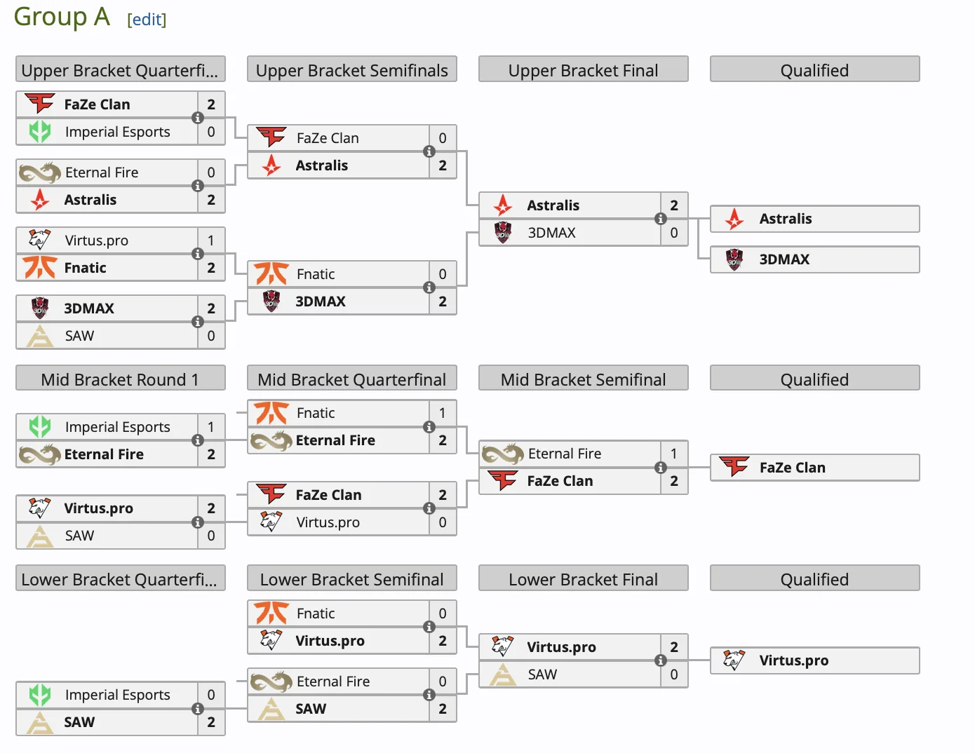 В группе "А" Virtus.pro выиграла последний слот, победив SAW со счетом 2:0. Astralis, 3DMAX и FaZe Clan также прошли в следующий этап турнира.