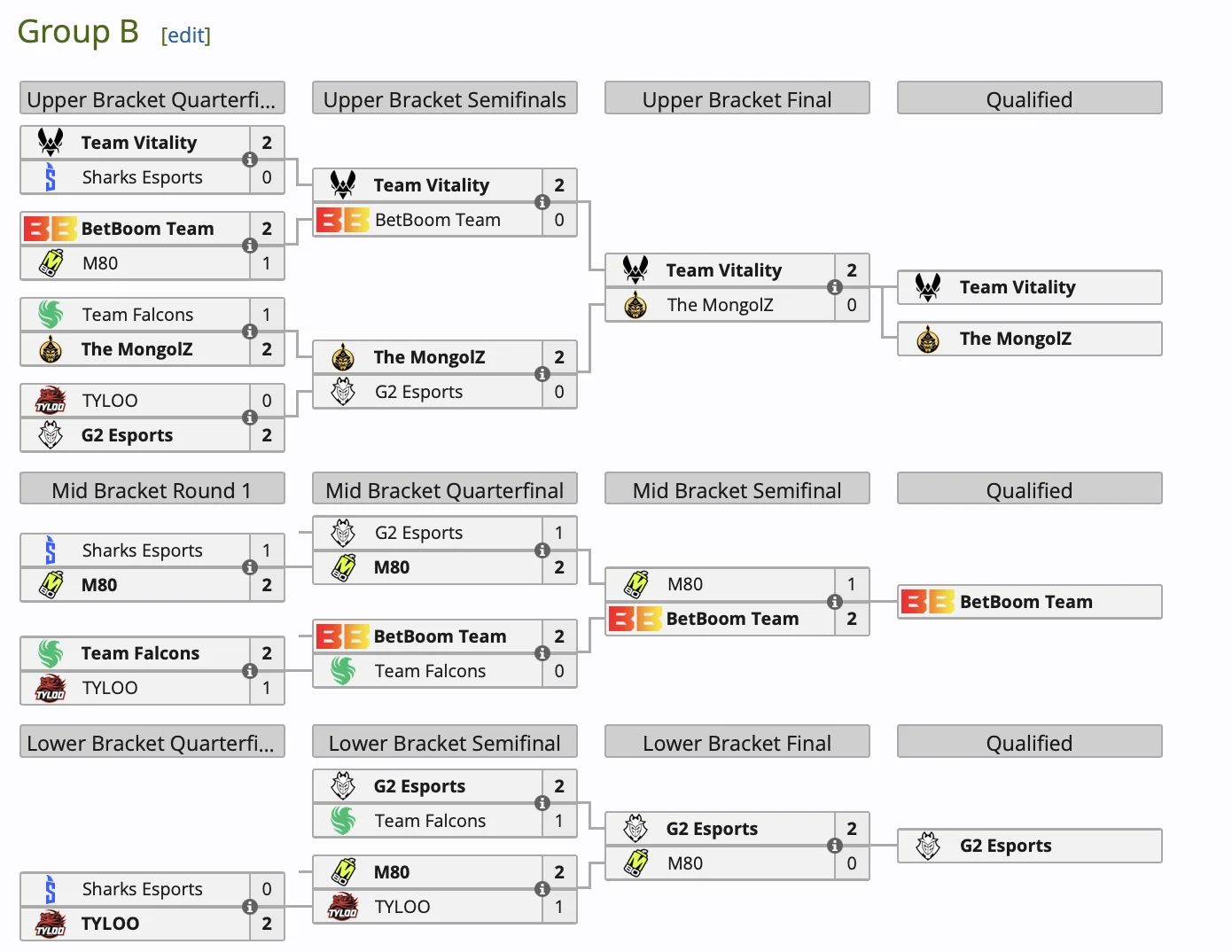 G2 Esports выиграла группу "В", обыграв M80 2:0. Team Vitality, The MongolZ и BetBoom Team также вышли из группы.
