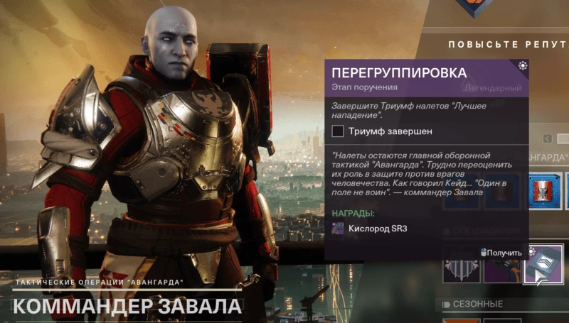 Чтобы завершить перегруппировку, вам необходимо выполнить лучшее нападение, один из многих триумфов, найденных в разделе налеты в вашей книге триумфа. Чтобы просмотреть, перейдите на страницу триумфы вашего инвентаря, затем выберите Авангард, а затем налеты. Здесь вы должны увидеть лучшее нападение в верхней части первой страницы. Вы можете просмотреть требования для Триумфа, а также отслеживать его из этой области.
