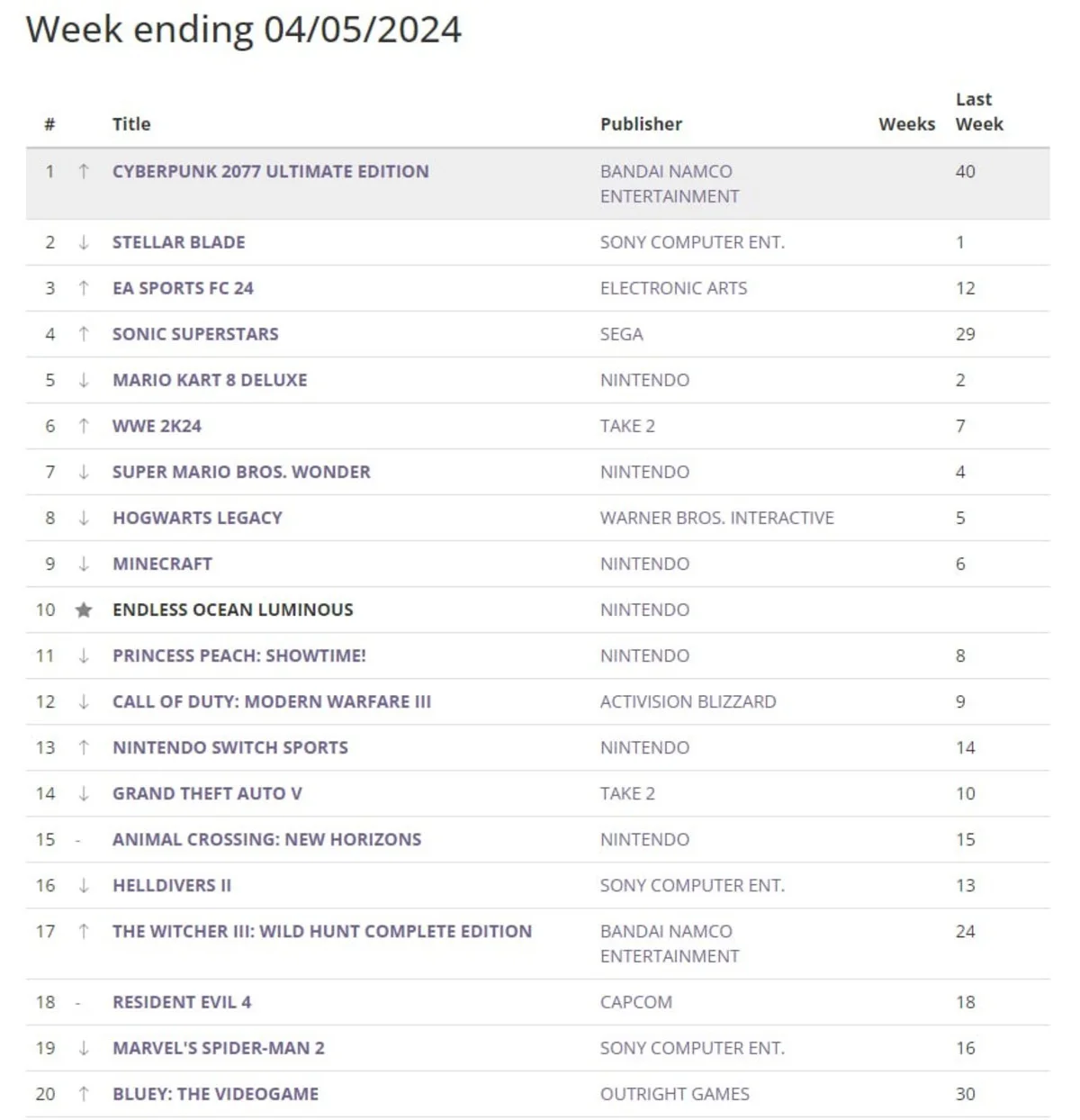 Лидером нового топа розницы в Великобритании стала Cyberpunk 2077 Ultimate Edition, которая на прошлой неделе занимала 40 место. Эта версия игры включает в себя как основную игру, так и дополнение Phantom Liberty. Благодаря своему успеху она сместила с первого места Stellar Blade, который теперь занял вторую позицию.