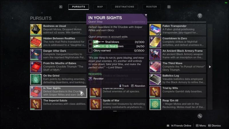 Чтобы начать процесс разблокировки ликвидатора, отправляйтесь к Лорду Шаксу в Башне и возьмите квест в зоне видимости. Этот квест состоит из одного шага, и включает в себя получение убийств с помощью снайперской винтовки и зарабатывание славы: