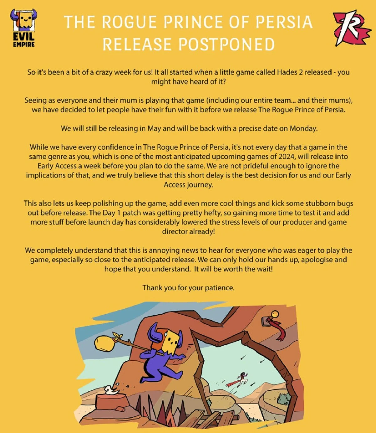 Разработчики Evil Empire объявили о переносе релиза рогалика The Rogue Prince of Persia из раннего доступа на неопределенный срок из-за выхода в ранний доступ Hades II. Однако обещают, что игра всё равно будет доступна в этом месяце, а конкретную дату огласят в понедельник.