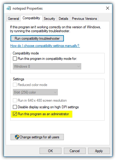 - Затем в свойствах > выберите вкладку Совместимость > установите флажок Запустить эту программу от имени администратора.