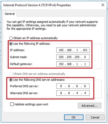 - Затем дважды щелкните Интернет-протокол версии 4 (TCP / IPv4). А в новой всплывающей панели выберите Использовать следующий IP-адрес и Использовать следующие адреса DNS-серверов.