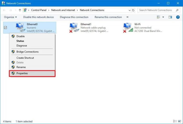 - И щелкните правой кнопкой мыши на подключении, которое вы используете,> щелкните Свойства.