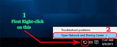 - В правом нижнем углу рабочего стола> щелкните правой кнопкой мыши значок сети > щелкните Открыть центр управления сетями и общим доступом.