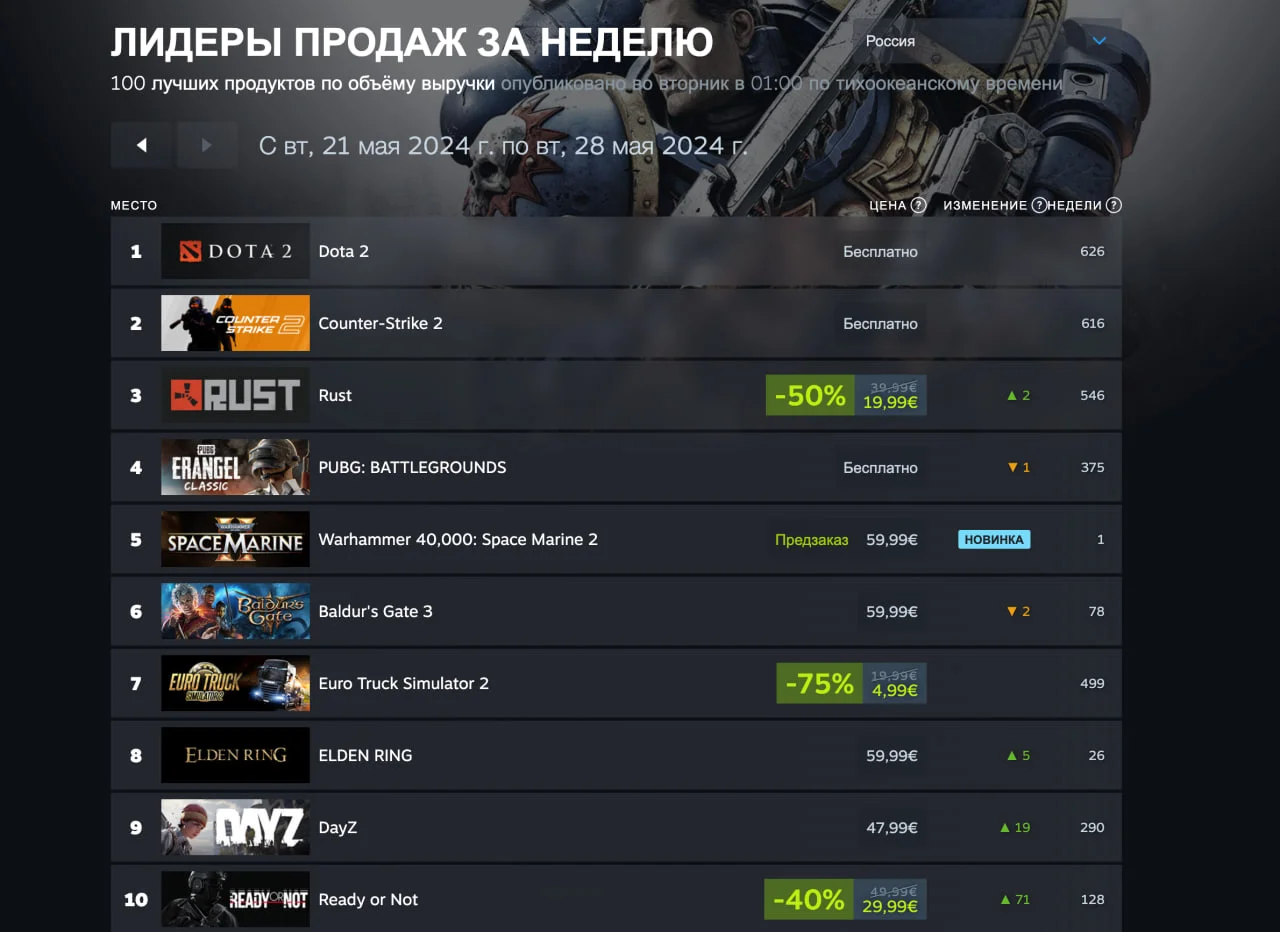 В Российском топе всё ещё лидируют CS2 и Dota 2, но на этот раз третье место удалось занять Rust. Также на пятом месте находятся предзаказы Warhammer 40,000: Space Marine II.