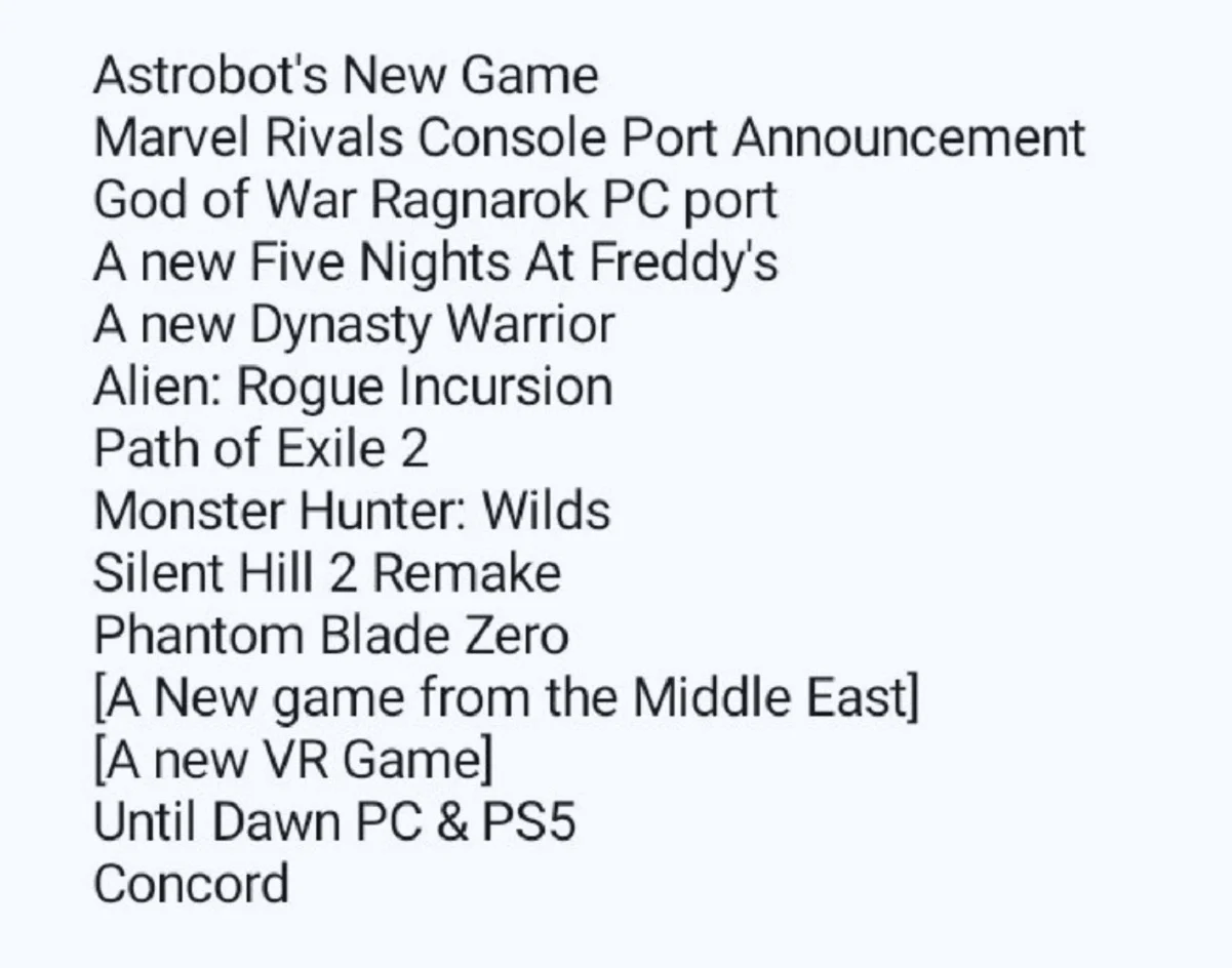 Инсайдер также сообщил, что Tencent может представить консольный порт многопользовательского шутера Marvel Rivals, а Sony объявит о том, что игра God of War: Ragnarok выйдет на PC. Среди уже анонсированных проектов, на шоу можно ожидать переиздание Until Dawn на PC и PS5, Silent Hill 2 Remake, Phantom Blade Zero, Monster Hunter Wilds, VR-игру Alien: Rogue Incursion и ролевой экшен Path of Exile 2. Также будут раскрыты детали о шутере Concord.