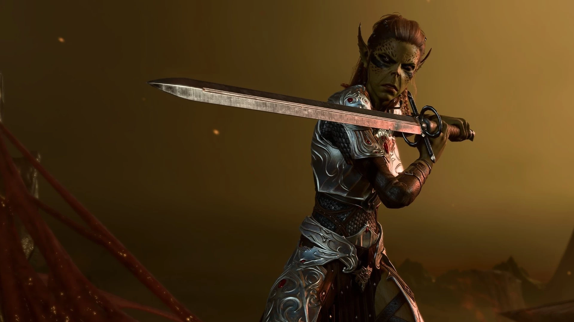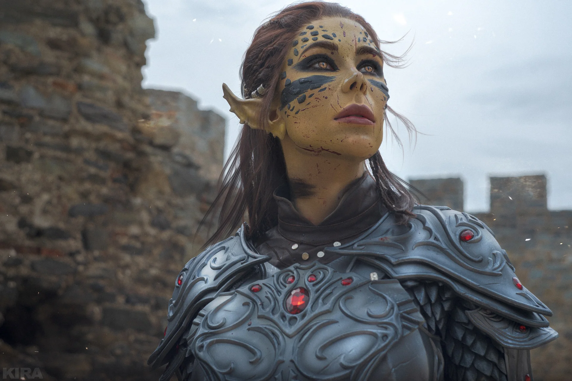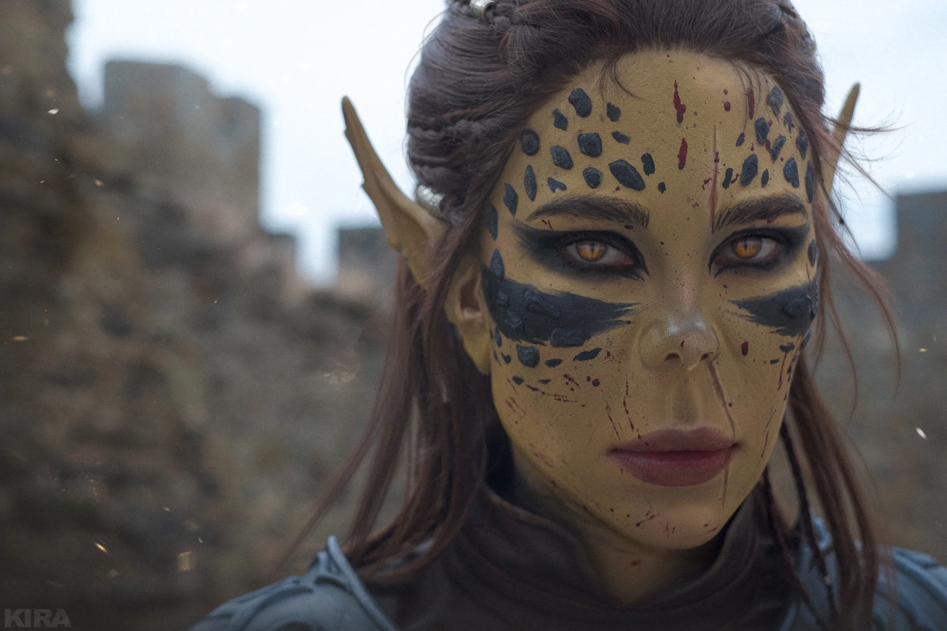 Ольга Хаку, известная как Frau_Haku, решила воплотить в жизнь образ гитьянки-воительницы Лаэзель из игры Baldur’s Gate III. Для этого она выбрала костюм, который в точности соответствует описанию персонажа: длинные темные волосы, желтовато-зеленая кожа и желтые глаза с вертикальными зрачками. Важным деталем образа стал вертикальный шрам на лице, который прорезает ее лицо от лба до подбородка.