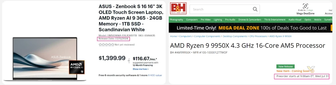 Несколько магазинов бытовой техники разместили информацию о датах выпуска ноутбуков, оснащенных процессорами AMD Ryzen AI 300, и настольных процессоров AMD Ryzen 9000 для сокета AM5. Предварительно эти данные не имеют официального подтверждения, однако они совпадают у нескольких торговых точек.