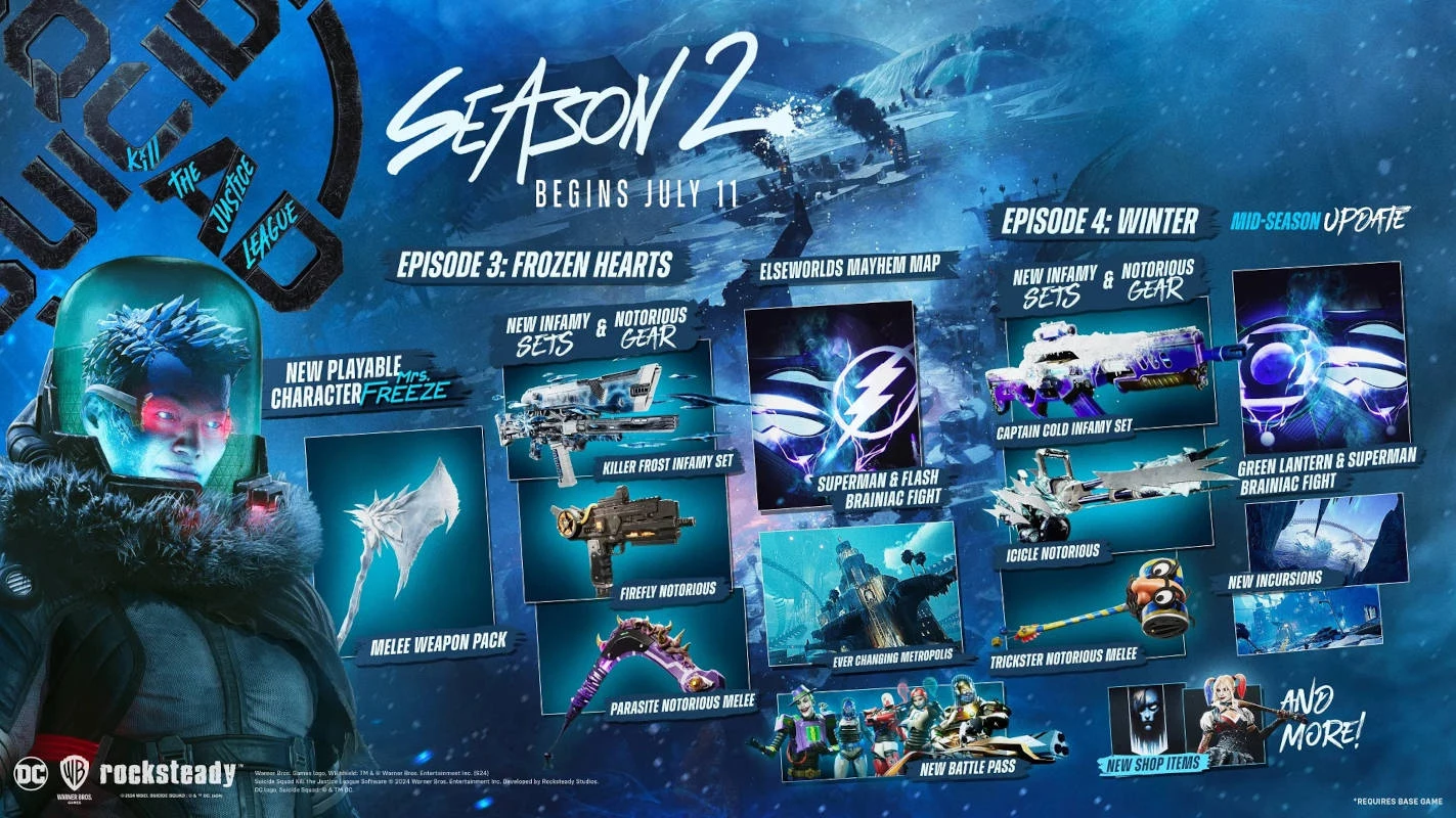 Некоторые предполагали, что разработчики перестанут обновлять игру из-за потери интереса со стороны игроков, однако студия Rocksteady Studios объявила о запуске второго сезона 11 июля. В нем появится новый персонаж – миссис Фриз, новое оружие, дополнительные битвы с Брейниаком, обновленная версия Метрополиса, миссии и активности, боевой пропуск, косметические предметы и другие изменения.
