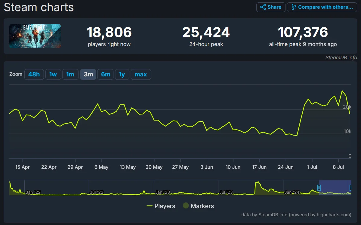 Более того, началась летняя распродажа в Steam, которая также способствовала увеличению онлайна игры. Battlefield 2042 получил существенные скидки - 90% на стандартное издание и 75% на элитное издание с добавленными специалистами, оружием, техникой и косметическими предметами.