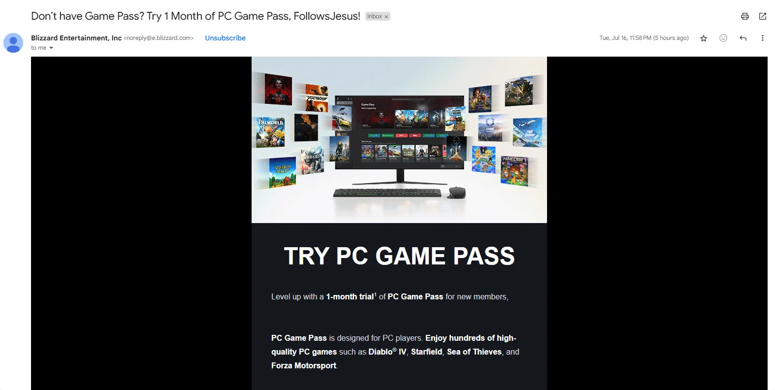 В интернете появилась информация о том, что компания Blizzard начала отправлять пользователям своих сервисов коды на месяц подписки PC Game Pass. В рекламном сообщении упоминается, что подписка позволит насладиться большим количеством игр, включая такие известные проекты, как Diablo IV, Sea of Thieves, Starfield и Forza Motorsport.