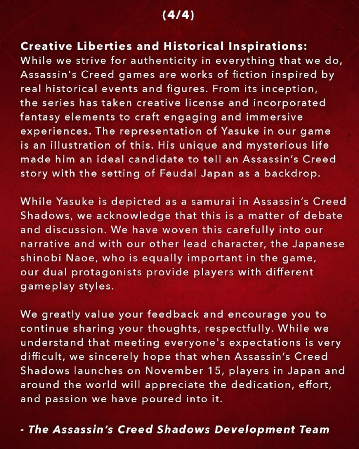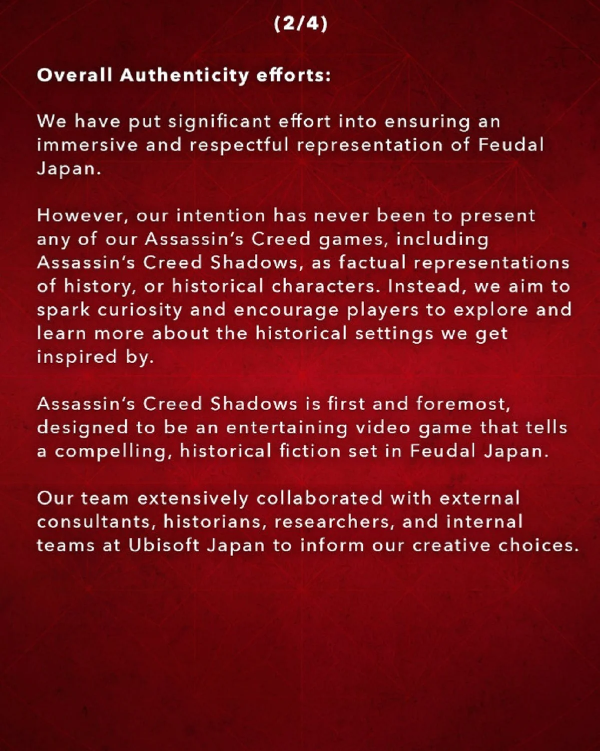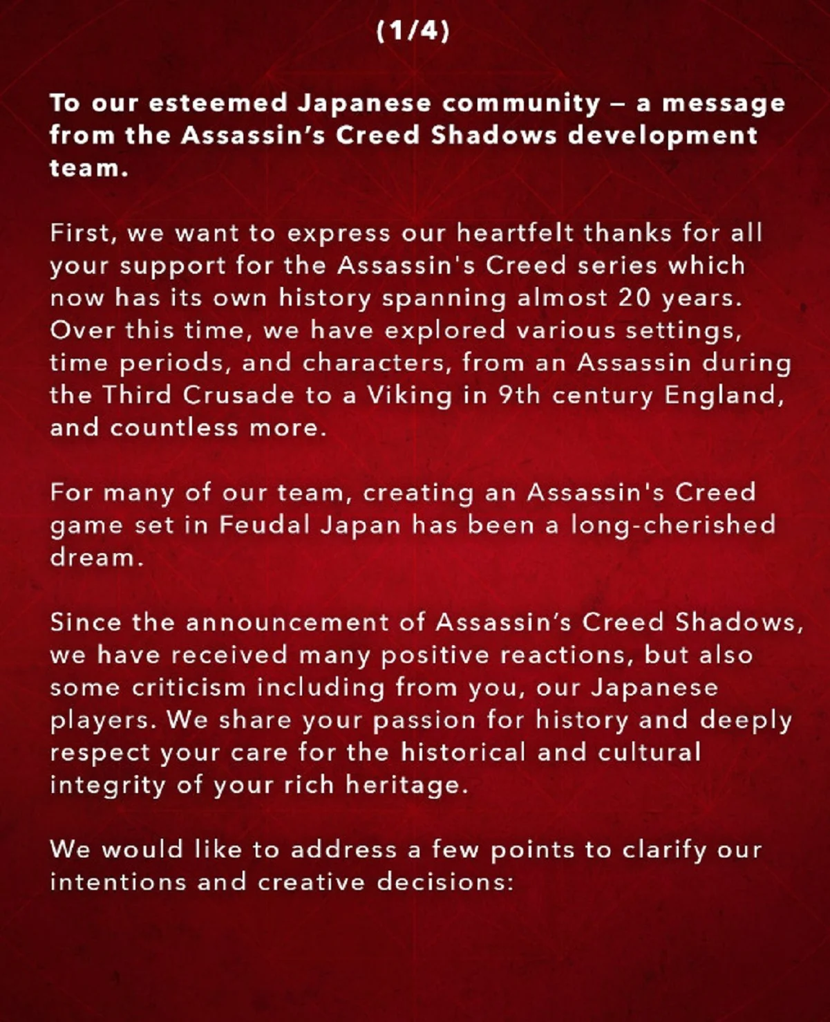 Ubisoft столкнулась с недовольством японских игроков в связи с творческими решениями в игре Assassin’s Creed Shadows, что могло повлиять на её релиз в Японии. Компания отметила, что за почти 20 лет существования серии Assassin’s Creed получила много положительных отзывов, но также и критику.