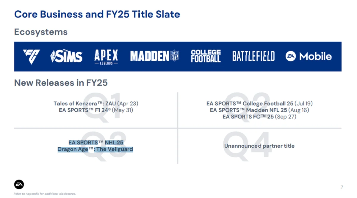 Ожидается, что Dragon Age: The Veilguard, от разработчиков BioWare, появится на рынке в промежутке с октября по декабрь 2024 года (третий квартал фин. года). В этот же период запланирован выход EA SPORTS NHL 25.