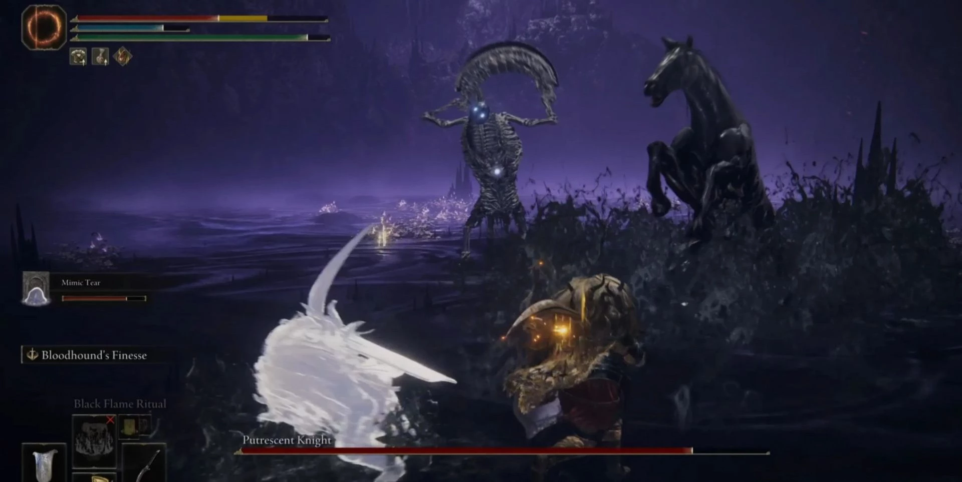 Однако это не всё. В отличие от других боссов на конях, Гниющий рыцарь способен слезть с животного. После ряда атак он прыгает и наносит удар, затем продолжает с земляными атаками, используя обе руки для вращательных получасовых атак, что осложняет ваше реагирование.