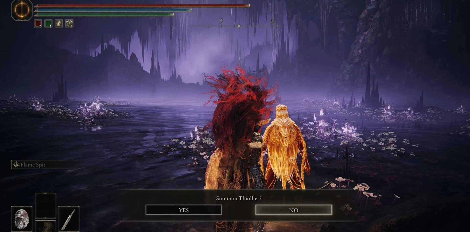 Вызвать Тиолье в качестве помощника можно, оказавшись на арене битвы. Не забывайте, что этот босс не является обязательным для прохождения, и вы можете к нему вернуться позже. Основная причина сражения с Гниющим рыцарем — продвигание квеста Тиолье.