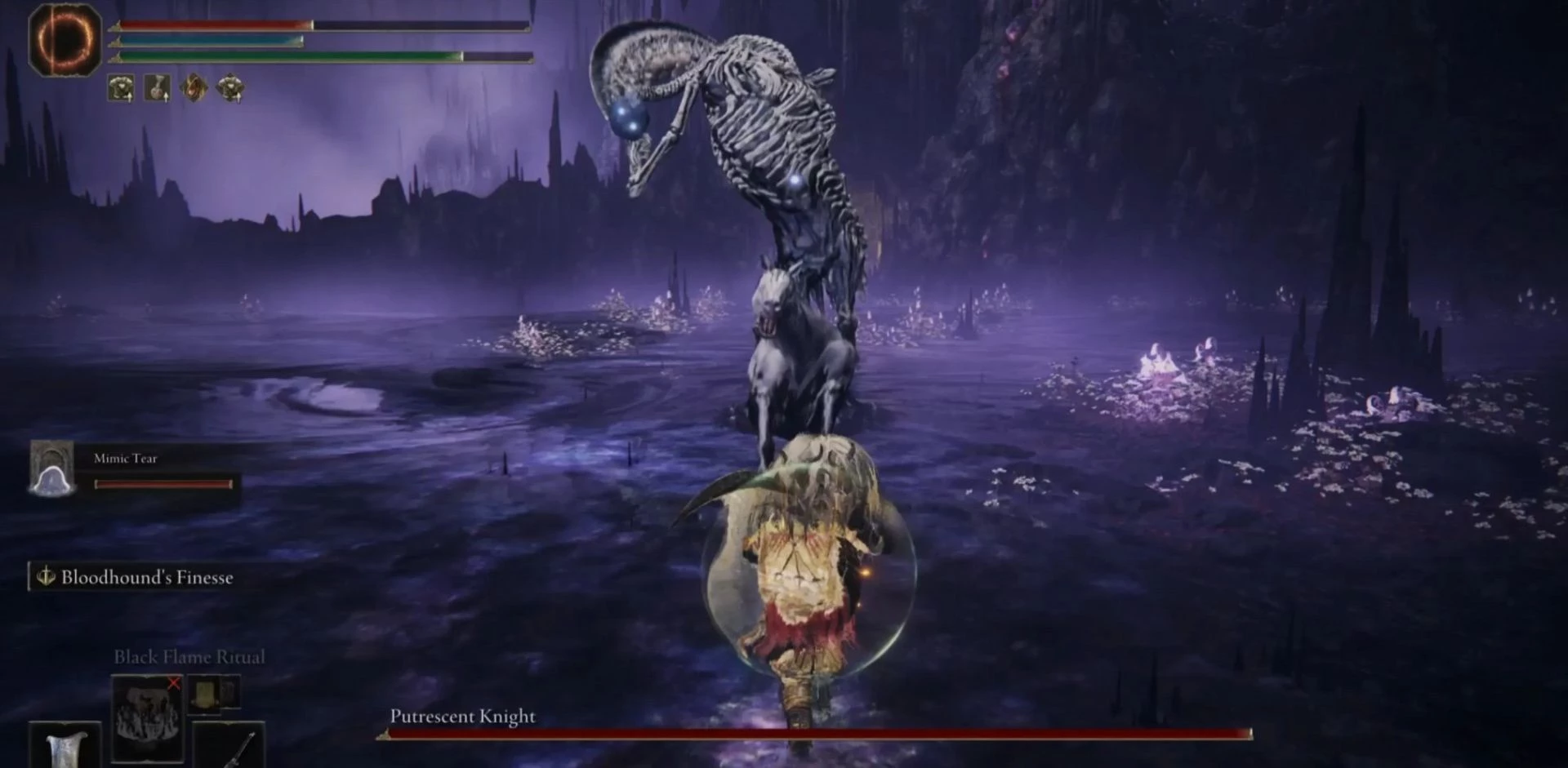 После тщательного изучения Глубин трещины, Гниющий рыцарь появляется на своем мертвом коне. Он всегда приходит с довольно значительного расстояния, что дает вам возможность воспользоваться Флягой с чудесным снадобьем или призвать помощника с помощью праха.