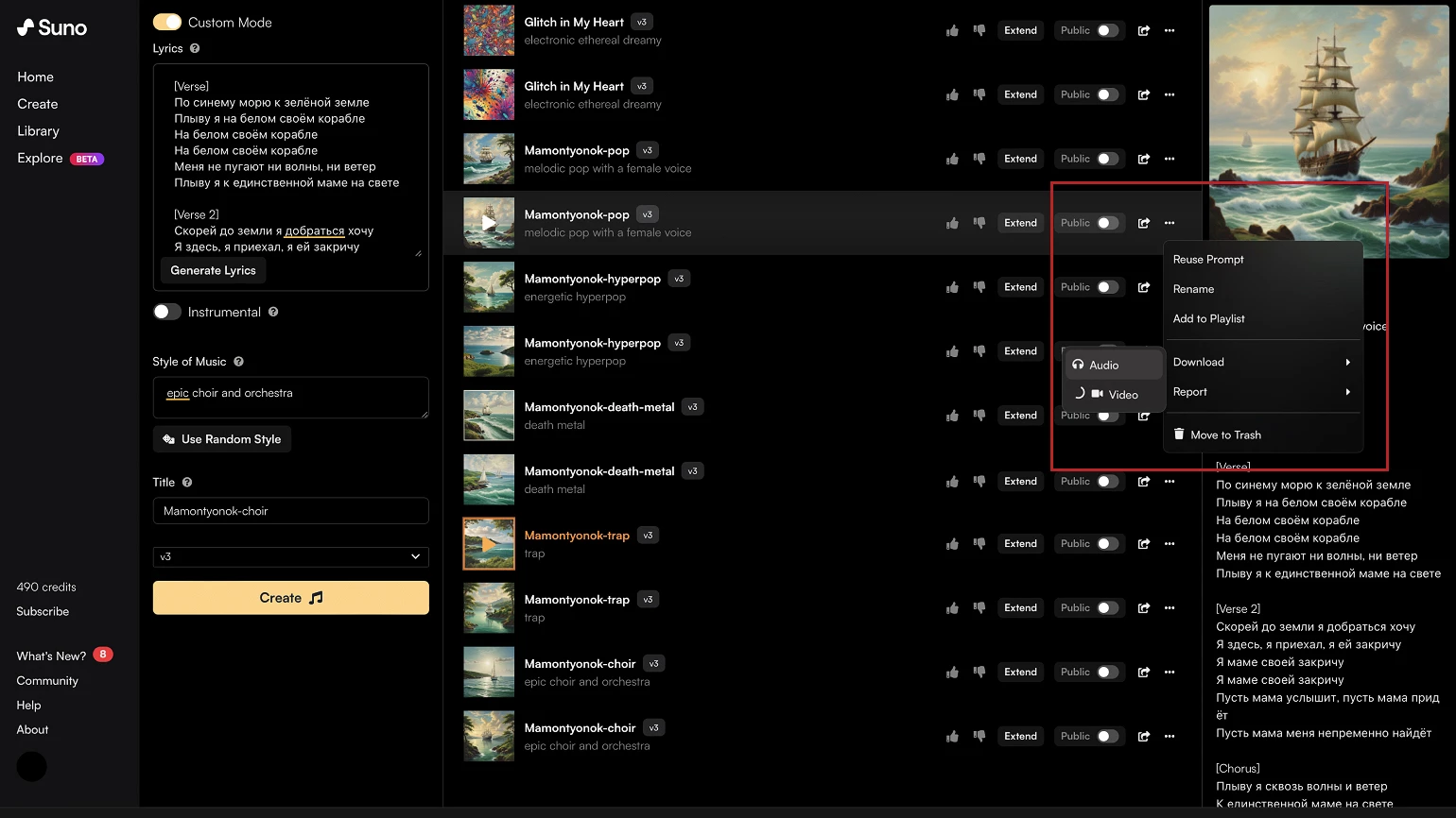 Созданные в Suno треки можно сохранять в аудио- и видеоформатах через раздел Library. Для этого следует выбрать трек, нажать на три точки и выбрать команду Download. Треки других пользователей доступны для прослушивания, оценки и распространения по ссылке.