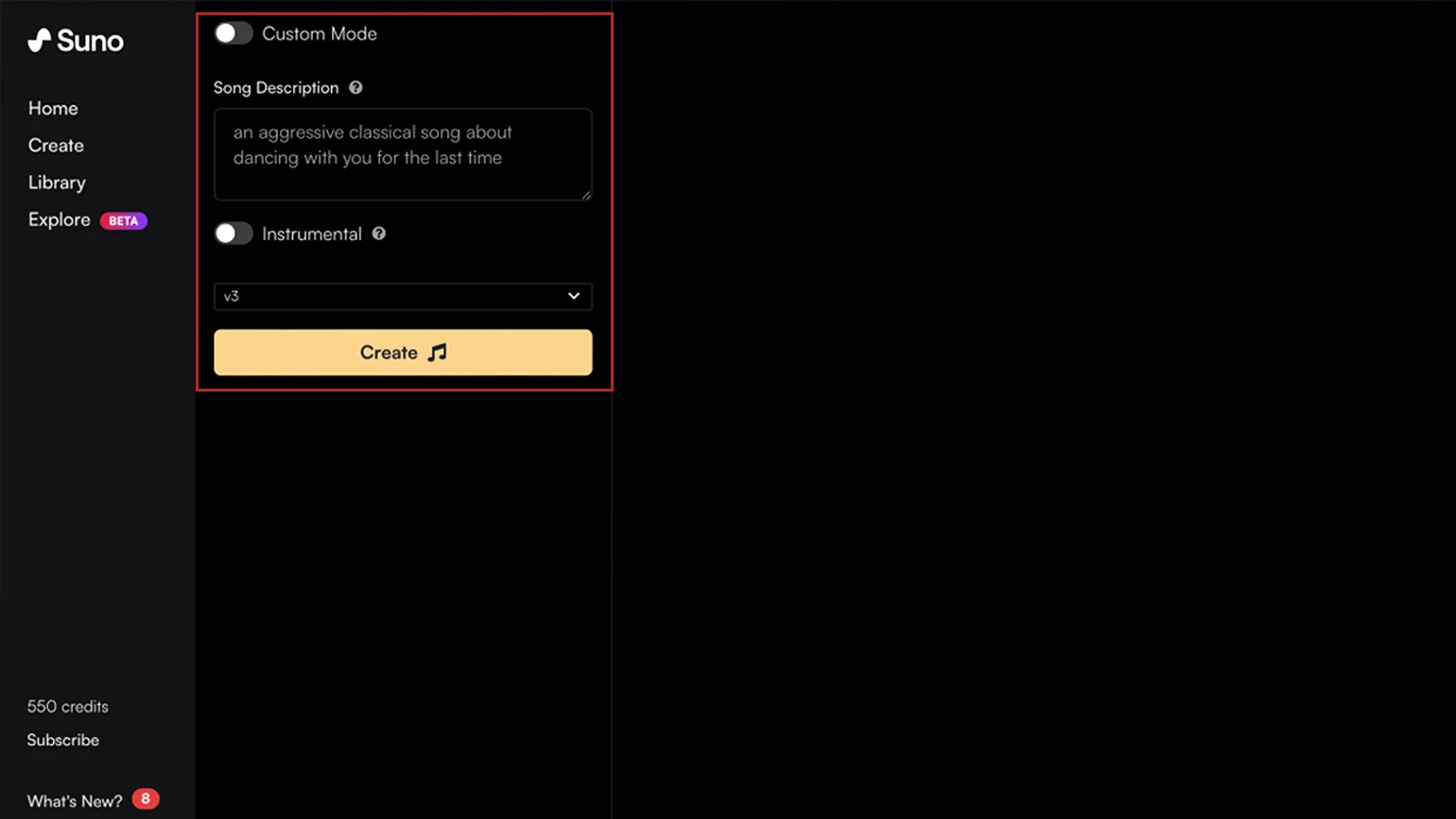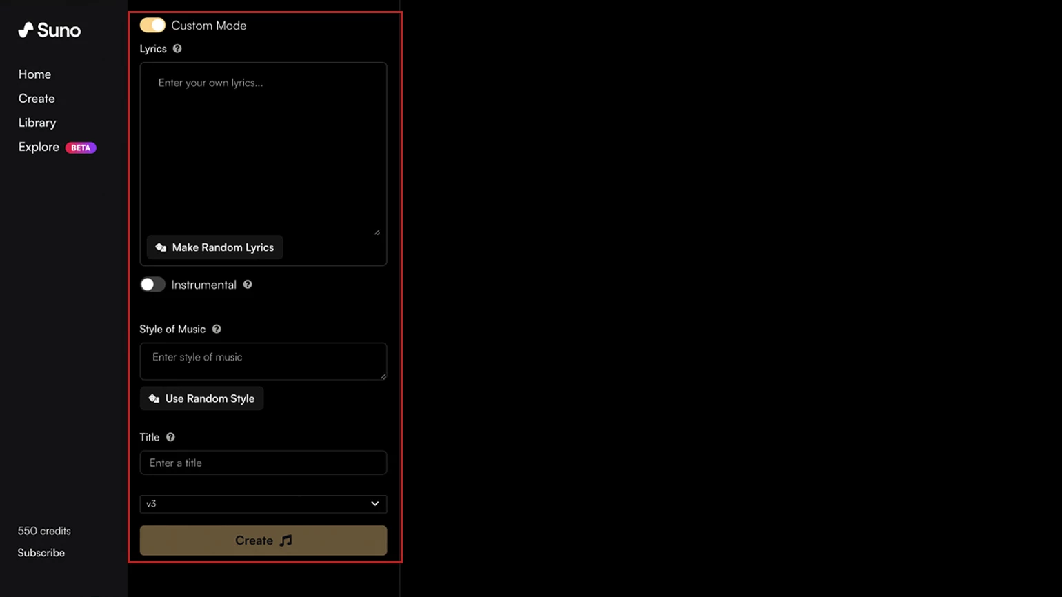 Чтобы перейти в продвинутый режим, нужно включить переключатель Custom Mode в разделе Create. В этом режиме можно ввести собственные слова для песни и выбрать жанр.