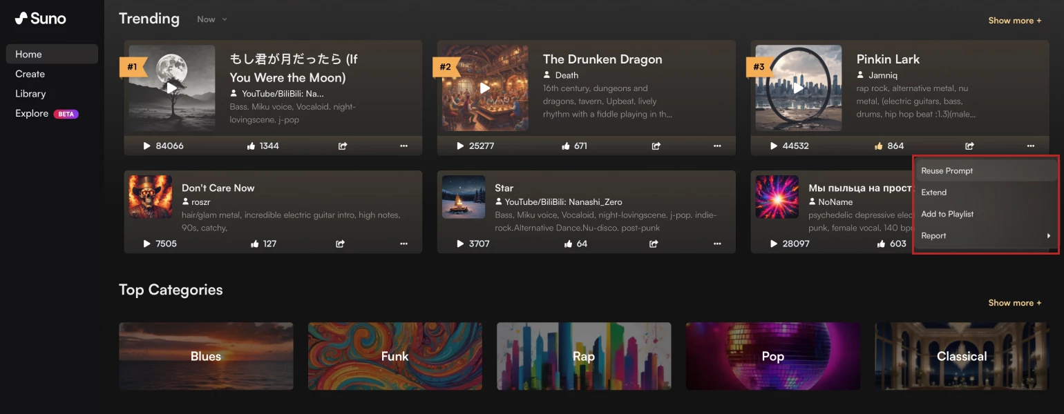 В Suno есть возможность создавать ремиксы, меняя жанр, настроение или текст песни. Для этого нужно выбрать пункт Reuse Prompt в меню трека. Откроется поле с промптом, который можно редактировать. С помощью функции Extend можно увеличить длительность фрагмента или создать новую композицию на его основе.