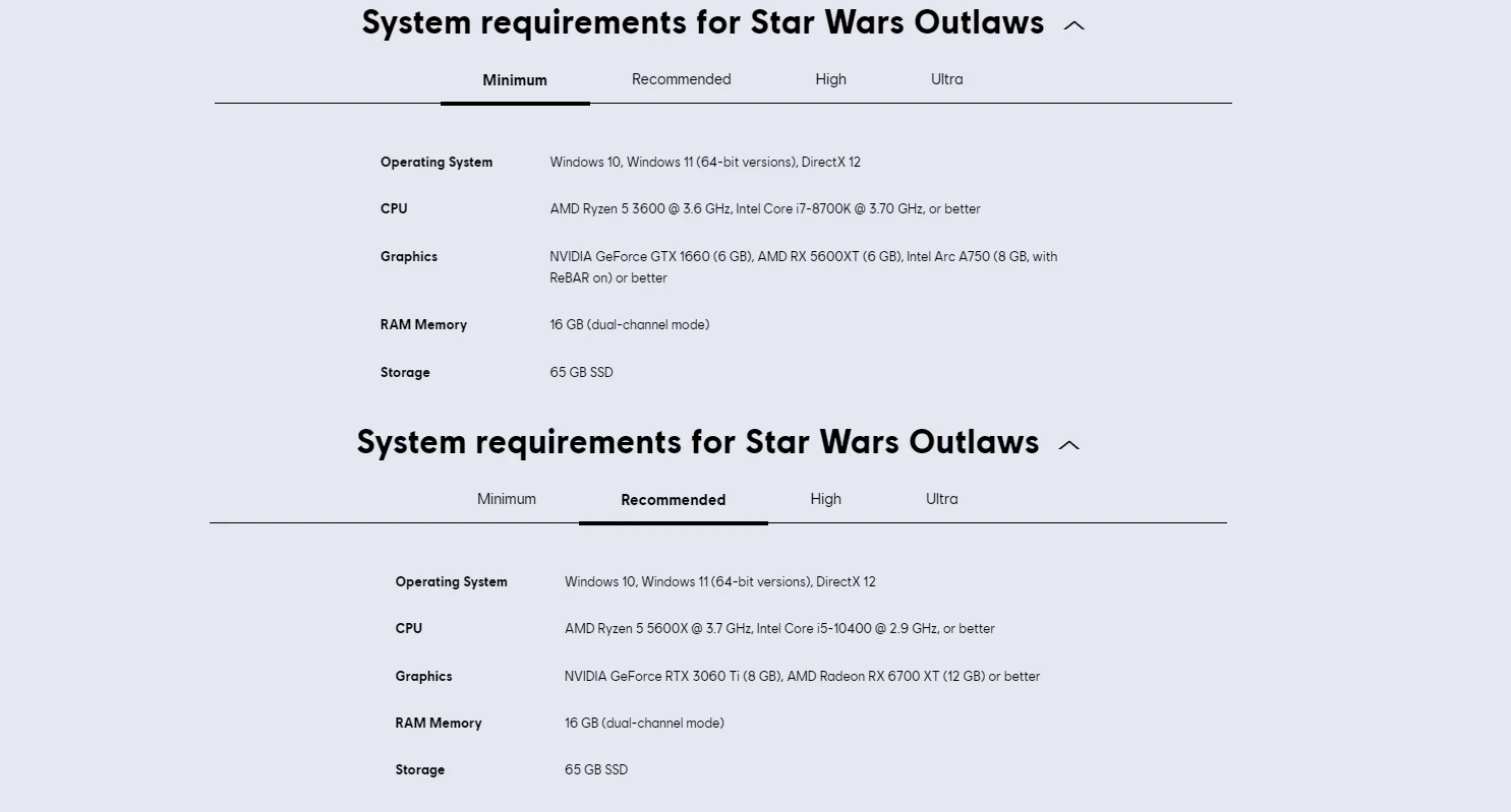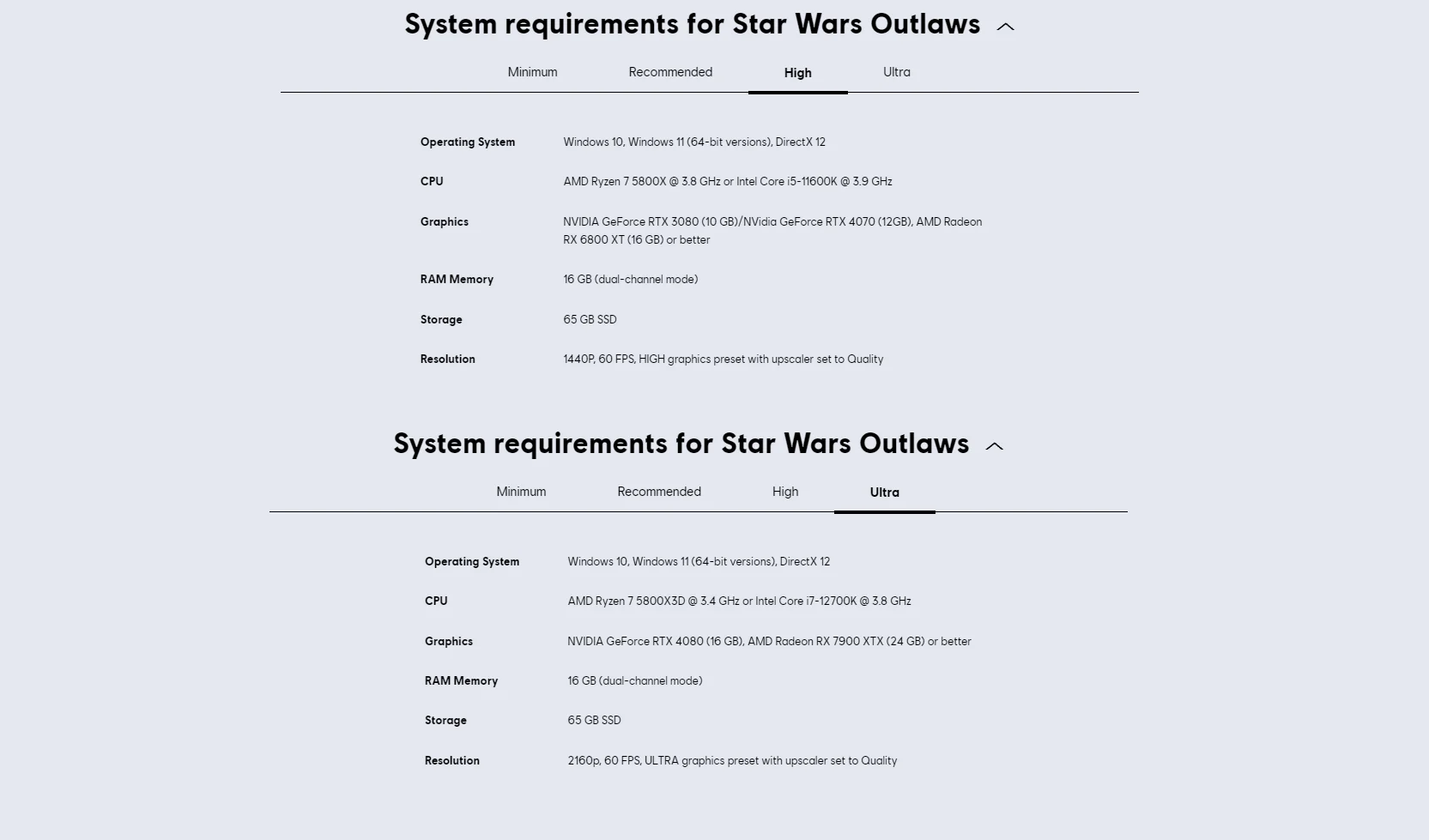 Ubisoft обновила информацию о Star Wars Outlaws в своём магазине, предоставив детализированные системные требования для компьютеров.