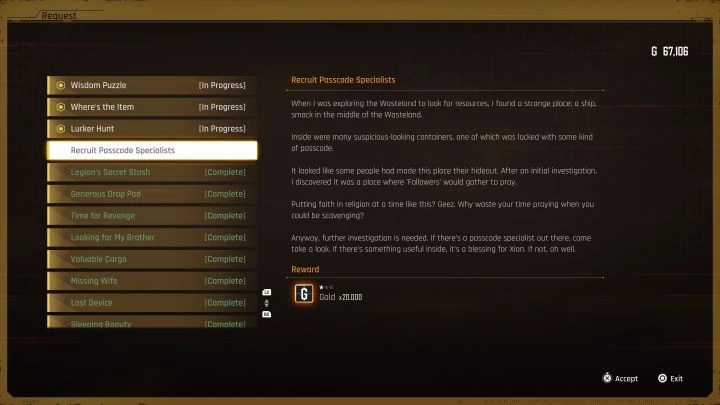 Поиск квеста можно начать на доске объявлений в Xion или Пустоши. Ваша цель — открыть контейнер, для чего потребуется скрытый код-пароль.
